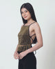 Elegantia presents an exquisitely crafted top featuring meticulous detailing that commands attention. Cascading gold beads drape gracefully downward, adorning the garment with refined sophistication and dynamic movement. Each bead is thoughtfully positioned to create a luxurious visual narrative that elevates any ensemble. The construction demonstrates expert-level craftsmanship, with premium materials selected to ensure both comfort and durability throughout wear. This statement piece seamlessly transitions from special occasions to elevated everyday styling, offering versatility wrapped in undeniable elegance. The interplay of light on the gold accents creates an ever-changing aesthetic that captures the essence of contemporary luxury.